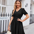 Son décolleté en V et ses manches courtes légèrement bouffantes apportent une note gracieuse à cette pièce incontournable. Les finitions délicates des manches et du bas de la robe, agrémentées de petits volants, ajoutent une touche sophistiquée et aérienne qui attire irrésistiblement les regards.